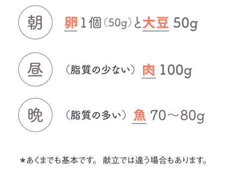 朝は卵や大豆、昼は肉、夜は魚、