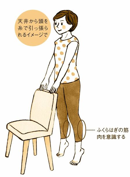 2)両足のかかとを2秒ほどかけて 上げつま先立ちになり、 2秒ほどかけて下げる。