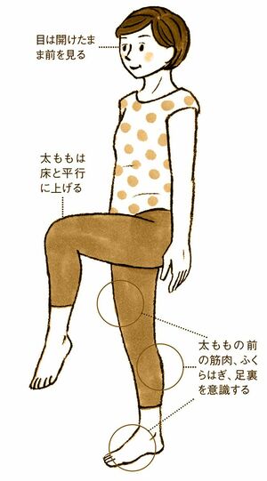 足を揃えて立ち、 片方のひざを90度に曲げて足を上げ、 1分間キープする。