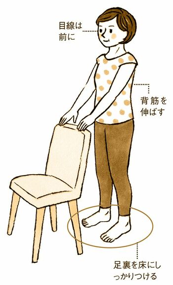 【レベル1】かかと上げ1)椅子の背に両手を添えて、 両足を肩幅に開き、まっすぐ立つ。